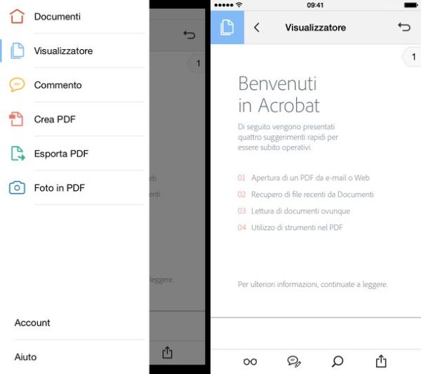 La sua interfaccia ricalca quasi perfettamente quella della controparte desktop. Sulla sinistra c'è una barra laterale (richiamabile facendo “tap” sull'icona in alto a sinistra) dalla quale si può accedere a tutte le funzioni della app: Documenti per selezionare i documenti PDF da aprire, Visualizzatore per tornare al documento visualizzato attualmente in Adobe Reader, Commento per aggiungere note ed evidenziazioni al documento, Crea PDF, Esporta PDF e Foto in PDF per accedere alle funzioni di editing e creazione riservate agli utenti pay.