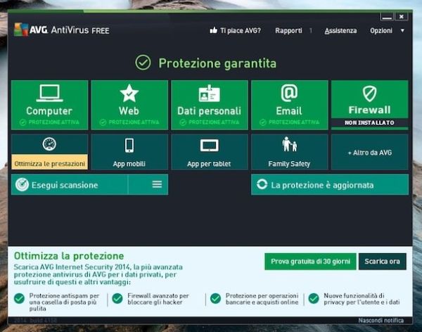 - AVG - antivirus estremamente conosciuto su scala globale che coniuga un controllo completo del sistema (compresa la navigazione Internet) ad un'interfaccia utente molto intuitiva. Non rallenta il PC ed è disponibile in due versioni: una gratuita ed una a pagamento, nella quale sono compresi anche strumenti per l'ottimizzazione del sistema, la protezione dei servizi di messaggistica e funzioni ottimizzate per la visualizzazione dei video in streaming.