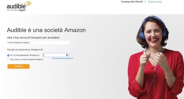 Per provare Audible, collegati al sito Internet del servizio da computer, smartphone o tablet e pigia sul pulsante Iscriviti - Gratis per i primi 30 giorni. Nella pagina che si apre, compila il modulo che ti viene proposto inserendo i dati di accesso del tuo account Amazon e clicca sul pulsante Continua (o Accedi) per andare avanti.