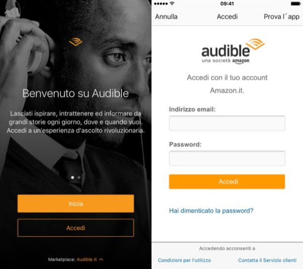 Dopo aver creato il tuo account, prendi dunque il tuo smartphone o il tuo tablet e scarica la app ufficiale di Audible per Android, iPhone/iPad o Windows 10. A download completato, avvia la app di Audible, pigia sul bottone accedi ed entra con i dati del tuo account.