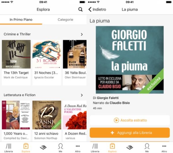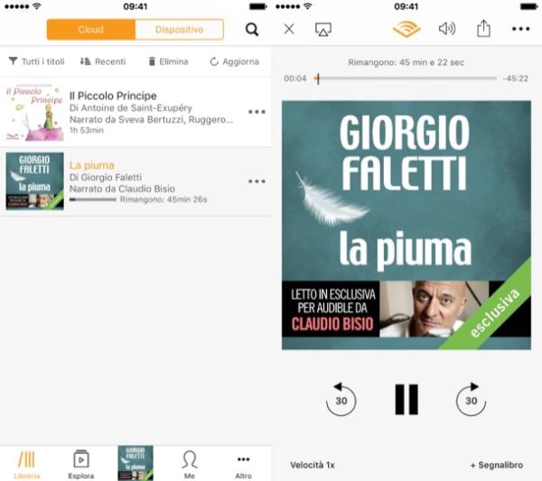 Il primo servizio che ti consiglio oggi è Audible di Amazon, il quale dà accesso a un catalogo composto da 2.000 audiolibri in lingua italiana e circa 10.000 audiolibri in altre lingue letti da narratori professionisti e attori noti. Fra i titoli disponibili ci sono best-seller recenti come “La ragazza del treno” di Paula Hawkins, “I racconti di Nené” di Andrea Camilleri e “La Piuma” di Giorgio Faletti e classici intramontabili come “Il piccolo principe”, ma non finisce qui! Il servizio ospita anche podcast, programmi radiofonici, guide turistiche, corsi di lingua e produzioni audio originali realizzate in esclusiva per i clienti di Audible.