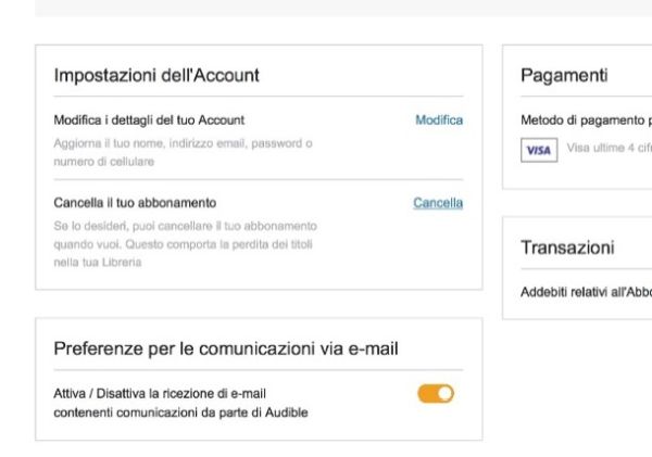 Come accennato in precedenza, Audible costa 9,99 euro/mese ma si può provare gratis per un mese. Se non hai intenzione di rinnovare la tua sottoscrizione al termine della trial, accedi ad Audible dal PC, clicca sul tuo nome che si trova in alto a destra e seleziona la voce Dettagli dell'account dal menu che compare. Nella pagina che si apre, clicca sul link Cancella situato accanto alla voce Cancella il tuo account, specifica il motivo per il quale stai abbandonando il servizio (es. Non lo uso abbastanza) e pigia sul bottone Cancella abbonamento per completare l'operazione.
