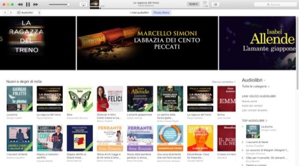 A questo punto, fai click sul pulsante Audiolibri su iTunes Store e divertiti a “sfogliare” tutti gli audiobook disponibili per l'acquisto. Ti verrà proposto un elenco di libri in formato audio nuovi e degni di nota con a fianco la classifica delle opere più scaricate in Italia. Grazie al menu a tendina Tutte le categorie posizionato nella barra laterale di destra è poi possibile sfogliare i libri in base al loro genere di appartenenza (es. Classici, Saggistica, Misteri e Gialli).