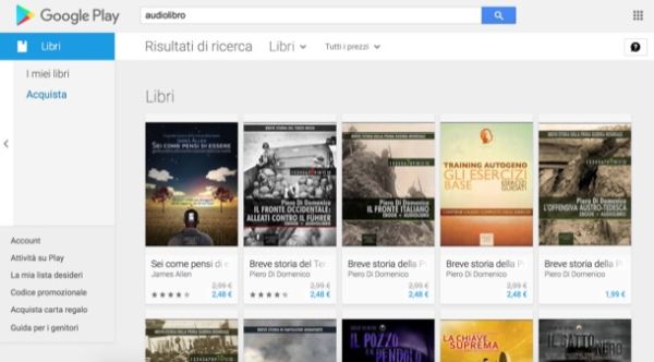 Per trovare i libri audio all'interno di Google Play non devi far altro che accedere allo store, recarti nella sezione dedicata ai libri ed effettuare una ricerca con il termine “audiolibro”. Ti verranno mostrati tutti i libri digitali venduti in coppia con la loro versione audio (spesso scaricabile cliccando su un link che si trova all'interno dell'opera stessa).