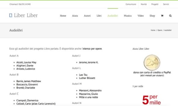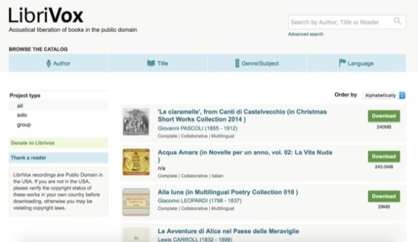 Un altro sito molto interessante, che ti consiglio di tenere nei preferiti, è LibriVox che offre grandi classici della letteratura e altri racconti di vario genere letti da volontari, i quali condividono i propri lavori online a costo zero. Le opere sono disponibili in varie lingue, fra cui fortunatamente non manca l'italiano.