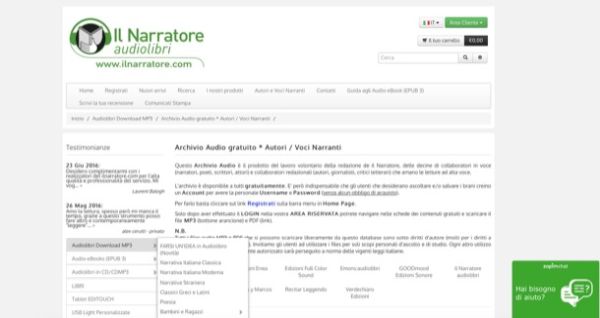 Ti segnalo anche il sito Il Narratore, che consente di acquistare degli audiobook in formato MP3 ed EPUB3 a prezzi compresi fra 2 e 15 euro. C'è anche una sezione del sito denominata Archivio Audio gratuito che permette di scaricare gratuitamente delle letture effettuate da alcuni collaboratori del sito, per accedervi è però necessario creare un account gratuito sul servizio cliccando sul pulsante Registrati collocato in alto a sinistra.