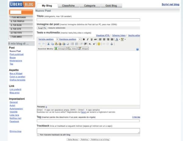 Missione compiuta! Ora il tuo blog gratis è online, disponibile per tutti e pronto ad accogliere i tuoi post. Per pubblicare il tuo primo articolo, torna sulla pagina principale di Libero Blog e clicca sul pulsante Nuovo post. A questo punto, redigi il post usando l'editor di Libero come se fosse un qualsiasi software di videoscrittura (es. Word o LibreOffice Writer).