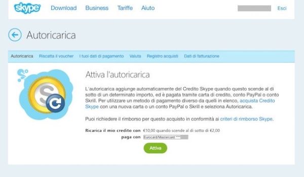 Per annullare i pagamenti ricorrenti, devi collegarti nuovamente al tuo profilo Skype tramite Web seguendole indicazioni di cui sopra, devi poi scorrere verso il basso la pagina Web che ti viene mostrata sino ad individuare la sezione Dati account e devi fare clic sulla voce Autoricarica.