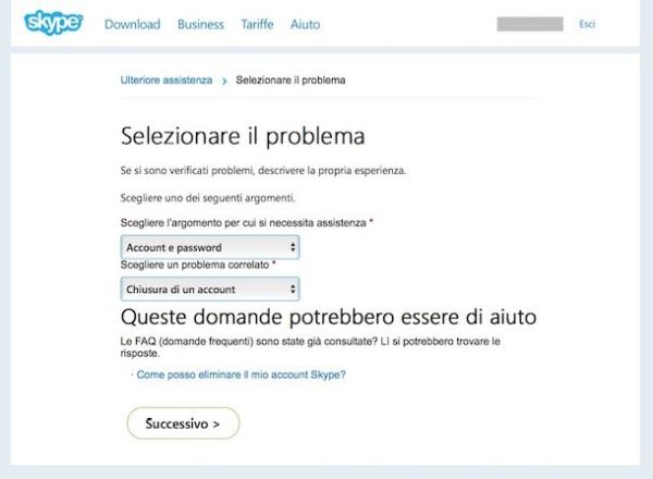 In seguito, pigia sul menu che ti viene mostrato, seleziona l'opzione Account e password, seleziona poi l'azione Chiusura di un account annessa al menu apparso sotto la voce Scegliere un problema correlato e poi pigia sul pulsante Successivo. Scegli quindi la voce Assistenza via chat dopodiché attendi che un operatore si metta in contatto con te e richiedi esplicitamente di procedere andando a cancellare account Skype.