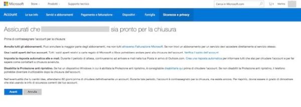 Se invece sei solito collegarti a Skype utilizzando il tuo account Microsoft, puoi cancellare completamente la tua utenza. Tieni però presente che si tratta di un'operazione sconsigliata in quanto comporterebbe la chiusura del tuo indirizzo email Outlook.com/Hotmail/Live e l'impossibilità di usare servizi online come Office Online e Xbox Live.