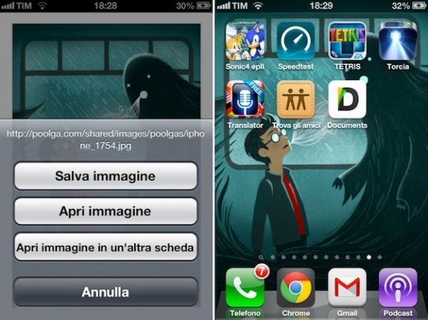 Per scaricare gli sfondi presenti su questi siti sul tuo “melafonino” e applicarli come wallpaper della home screen e/o della lock-screen, pigia sulle anteprime delle immagini in modo da aprire la loro versione a dimensioni originali, dopodiché tieni il dito premuto per qualche secondo sullo sfondo da scaricare e seleziona la voce Salva immagine dal menu che compare.