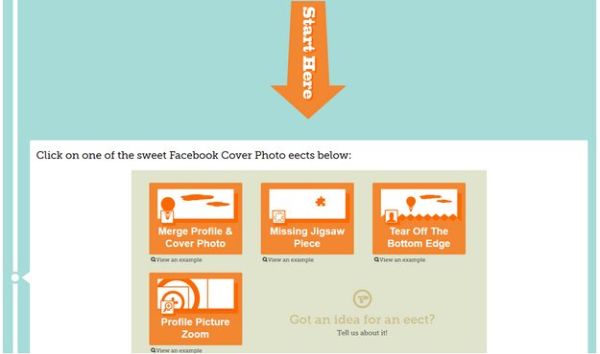 Se vuoi una maniera facile e veloce per abbellire una pagina Facebook creando delle immagini di copertina personalizzate, ti consiglio di utilizzare Tricked Out Timeline. Si tratta di un servizio online gratuito che in pochi semplici click permette di creare delle cover per Facebook davvero spettacolari partendo da qualsiasi foto. Per usarlo, non devi far altro che collegarti alla sua home page e cliccare sulla freccia arancione con la scritta Start Here.