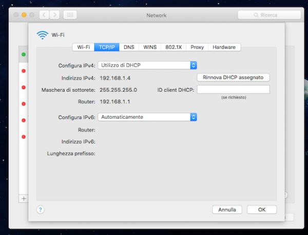 Se invece invece stai utilizzando un Mac puoi conoscere l'indirizzo IP grazie al quale riuscire ad accedere router Fastweb facendo clic sull'icona di Preferenze di sistema (puoi trovare l'icona sul Dock, nella cartella Applicazioni oppure puoi accedervi mediante il Launchpad) e cliccando sulla voce Network. Nella finestra che a questo punto ti verrà mostrata seleziona il nome della connessione in uso e clicca sul pulsante Avanzate... che si trova in basso a destra. Cliccando poi sulla scheda TCP/IP troverai l'indirizzo a cui devi collegarti indicato accanto alla dicitura Router.