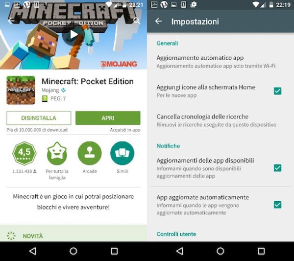 Successivamente, individua l'icona di Minecraft Pocket Edition, selezionala e fai "tap" prima sul pulsante Aggiorna e poi sul pulsante Accetto (nella schermata che si apre) per avviare il download dell'ultima versione del gioco.