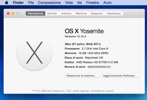 In alternativa puoi verificare la disponibilità di eventuali aggiornamenti per Safari anche pigiando sul pulsante Mela annesso nella parte in alto a sinistra della barra dei menu, scegliendo la voce Informazioni su questo Mac dal menu visualizzato e pigiando poi sul pulsante Aggiornamento Software… presente nella finestra che è andata ad aprirsi.