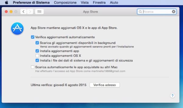 Per attivare gli aggiornamenti automatici pigia sull'icona di Preferenze di Sistema presente sul dock o nella cartella Applicazioni. Una volta visualizzata la finestra di preferenze di sistema pigia su App Store.