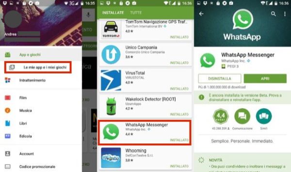 Una volta avviato il Play Store, pigia sul pulsante ≡ collocato in alto a sinistra, seleziona la dicitura Le mie app e i miei giochi dalla barra che compare di lato e cerca l'icona di WhatsApp nella sezione Installate.
