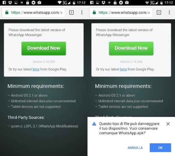 Avvia quindi Chrome o qualsiasi altro browser ci sia installato sul tuo smartphone, collegati alla pagina whatsapp.com/android e pigia sul bottone Download Now per avviare lo scaricamento del pacchetto d'installazione di WhatsApp. Se ti viene chiesta la conferma per lo scaricamento del file, pigia su OK e scegli il tuo browser come applicazione con cui effettuare il download.