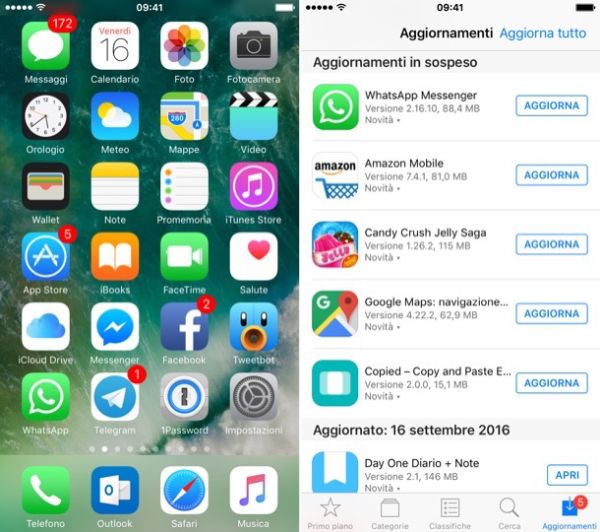 Se utilizzi un iPhone, puoi aggiornare WhatsApp gratis in pochi e semplici step. Tanto per cominciare, avvia App Store pigiando sull'icona azzurra con la lettera "A" che si trova in home screen. Successivamente, pigia sulla scheda Aggiornamenti collocata in basso a destra, individua l'icona di WhatsApp e premi sul pulsante Aggiorna che si trova accanto al nome dell'applicazione. In questo modo, se è disponibile un aggiornamento per WhatsApp, questo verrà installato istantaneamente sul telefono.