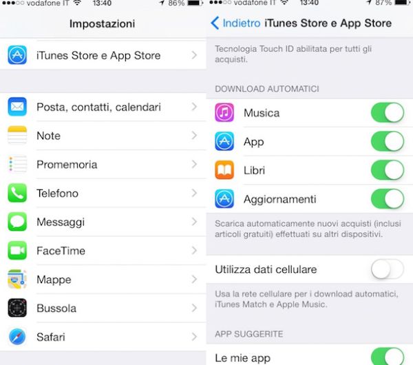 Se hai dovuto avviare manualmente la ricerca di aggiornamenti per WhatsApp, il sistema di aggiornamenti automatici di iOS potrebbe non essere attivo. Per far fronte alla cosa, recati nel menu Impostazioni di iOS (l'icona dell'ingranaggio che si trova in home screen), spostati su iTunes Store e App Store e imposta su ON la levetta relativa all'opzione Aggiornamenti.