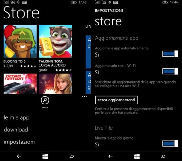 Successivamente, pigia sul pulsante (...) che si trova in basso a destra e seleziona la voce impostazioni dal menu che compare in basso. Nella schermata che si apre, assicurati che siano attivate le levette relative alle opzioni Aggiorna le app automaticamente e Aggiorna solo con il Wi-Fi e pigia sul bottone cerca aggiornamenti.
