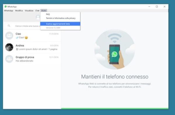 L'aggiornamento della versione PC di WhatsApp dovrebbe essere automatico ma, se vuoi, puoi attivare l'installazione delle beta (quindi delle versioni di anteprima potenzialmente instabili) dell'applicazione selezionando l'apposita voce dal menu Aiuto (su Windows) o dal menu WhatsApp (su macOS). Mi raccomando, usa questa funzione solo se sai bene dove mettere le mani!