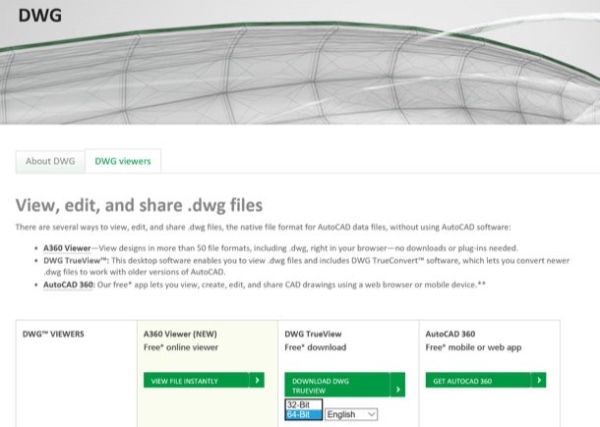 Per scaricare DWG TrueView sul tuo PC, collegati al sito Internet del programma, seleziona la voce 32-bit o 64-bit dal menu a tendina collocato al centro della pagina (a seconda se utilizzi un sistema operativo a 32 o 64 bit) e clicca sul pulsante Download DWG TrueView.