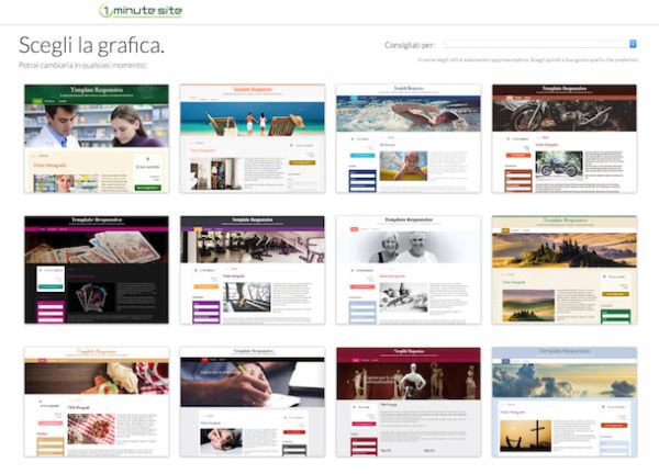 Scegli adesso il tema grafico che vuoi usare per il tuo spazio online selezionando la sua categoria di appartenenza dal menu a tendina Consigliati per collocato in alto a destra e cliccando sul pulsante Scegli questo che puoi visualizzare portando il cursore del mouse sull'anteprima del template di interesse.