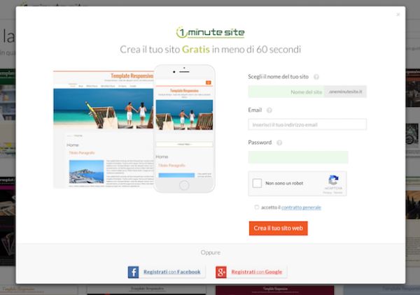Compila ora i campi annessi alla nuova schermata visualizzata digitando il nome del tuo sito Internet nella sezione sottostante la voce Scegli il nome del tuo sito, inserendo il tuo indirizzo di posta elettronica nella sezione collocata sotto la dicitura Email e digitando una password da associare al tuo account su 1 Minute Site immettendola nel campo sottostante la voce Password. Apponi poi un segno di spunta sulla casella collocata accanto alla voce Non sono un robot, spunta la casella presente accanto alla dicitura accetto il contratto generale e pigia sul pulsante Crea il tuo sito web. In alternativa puoi anche registrarti al servizio utilizzando il tuo account Facebook o Google cliccando sugli appositi pulsanti Registrati con Facebook e Registrati con Google e fornendo poi i dati richiesti.