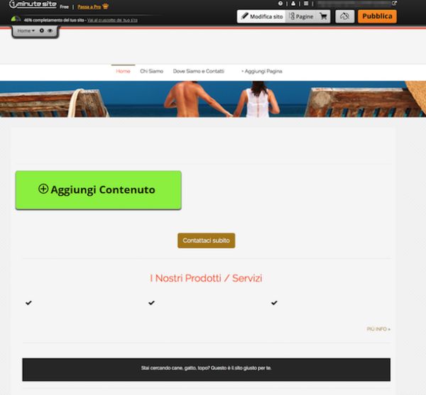 Clicca ora sul bottone Ok, ho capito collocato al centro dello schermo dopodiché ti verrà mostrato un editor mediante il quale modificare il sito Internet appena creato. Per modificare il tuo sito Internet non devi far altro che cliccare sopra gli elementi che visualizzi e sostituire i contenuti predefiniti con contenuti a tua scelta sfruttando i riquadri che compaiono. Utilizzando invece i comandi visibili portando il cursore del mouse sul pulsante Aggiungi contenuto puoi arricchire il tuo sito di elementi quali video di YouTube, mappe di Google, album fotografici, nuovi paragrafi di testo e molto altro ancora.