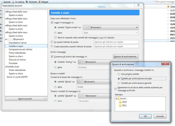 Se vuoi archiviare la posta elettronica ed utilizzi Mozilla Thunderbird, devi recarti nel menu Strumenti del programma e selezionare la voce Impostazioni account dal menu che compare. Nella finestra che si apre, clicca prima sulla voce Cartelle e copie nella barra laterale di sinistra e poi sul pulsante Opzioni di archiviazione. Metti quindi il segno di spunta accanto al tipo di cartella che vuoi usare per l'archiviazione dei tuoi messaggi (annuale o mensile) e clicca sul pulsante OK per due volte consecutive per salvare i cambiamenti.