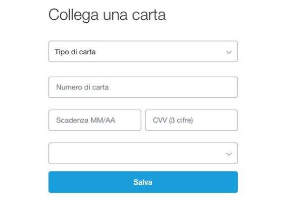Nella pagina che si apre, seleziona VISA o MasterCard dal menu a tendina Tipo (a seconda del tipo di PostePay che intendi associare a PayPal) e compila il modulo con tutti i dati della carta: numero, data di scadenza e CVV (il codice segreto di tre cifre che trovi sul retro della carta). Dopodiché pigia sul bottone Salva e il gioco è fatto.