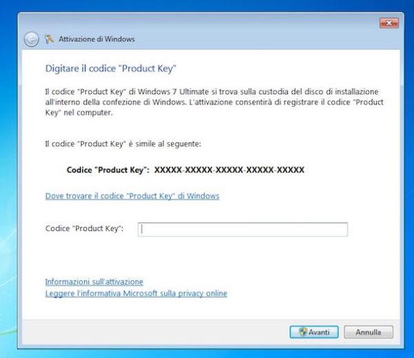 Adesso scorri la finestra che si apre fino in fondo e clicca sulla voce xx giorni rimasti per l'attivazione. Attivare Windows adesso (al posto di xx ti vengono indicati i giorni restanti a tua disposizione per poter attivare Windows) per far partire la procedura guidata per attivare Windows. Ora clicca sul pulsante Attiva Windows online e digita il codice di 25 caratteri (numeri e lettere mischiati) che hai trovato sulla confezione del sistema operativo, sul case del computer oppure nella mail ricevuta al momento dell'acquisto dell'OS nel campo Codice “Product Key”. Clicca quindi sul pulsante Avanti che si trova in basso a destra e attendi che la tua copia di Windows 7 venga attivata.