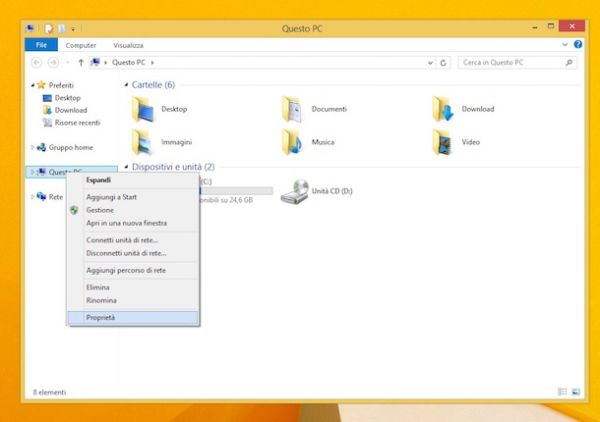 Se possiedi un PC con su installata una copia di Windows 8 o di Windows 8.1 e vuoi sapere come fare per attivare Windows perché non hai ancora provveduto ad inserire il product key relativo alla copia del sistema operativo in tuo possesso accedi al desktop ed apri Esplora file pigiando sull'icona raffigurante una cartella di colore giallo presente nella barra delle applicazioni. Nella finestra che si apre, fai clic destro sulla voce Questo PC che si trova sulla sinistra e seleziona la voce Proprietà dal menu che compare.