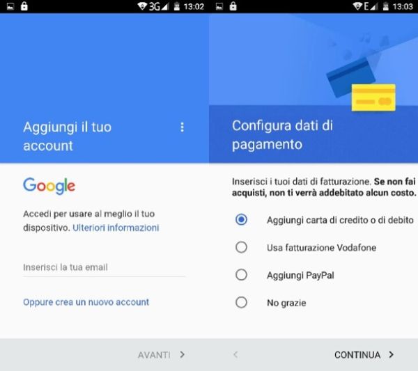 Se invece ti viene chiesto di impostare un metodo di pagamento, associa il tuo account a una carta di credito o a un conto PayPal. Puoi pure selezionare la voce No grazie e saltare questo passaggio ma non potrai acquistare contenuti a pagamento dal Play Store.