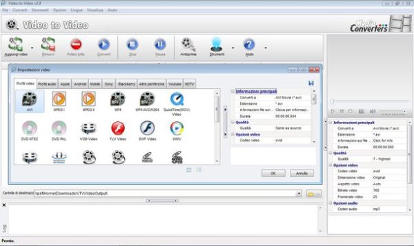 Il primo convertitore che ti consiglio di provare è Video to Video Converter che rispetto agli altri software menzionati in questo post ha il vantaggio di essere portatile, può essere scaricato ed eseguito direttamente (dal PC o da una chiavetta USB) senza affrontare noiosi processi d'installazione. Inoltre supporta tutti i formati di file video più diffusi e permette di regolare anche i parametri più avanzati dei video di output, come ad esempio dimensione dei fotogrammi e bitrate.