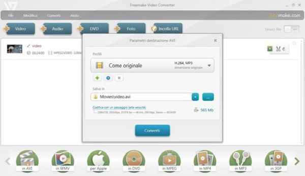 Al termine dell'installazione, per convertire un video con Freemake, non devi far altro che trascinarlo nella finestra del programma e selezionare uno dei profili di conversione elencati in basso. Puoi scegliere formati di video standard (es. MP4, AVI, WMV), profili di conversione dedicati a dispositivi portatili specifici (es. Android) oppure creare dei DVD video completi di menu: tutto in pochi click e avendo la possibilità di regolare a fondo la qualità di output.