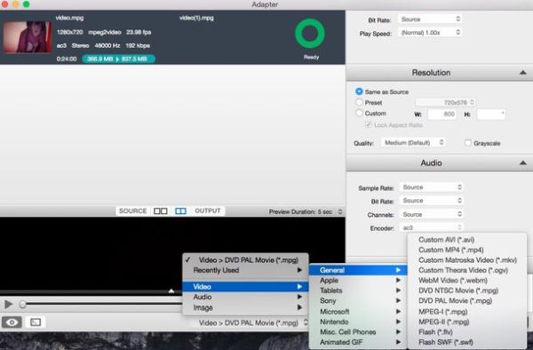 Per concludere, ti voglio parlare di Adapter, un software gratuito per cambiare formato video su Mac che ha dalla sua un'interfaccia utente estremamente intuitiva e il supporto a tantissimi formati di file differenti. Puoi usarlo per creare video ottimizzati per smartphone e tablet, video da masterizzare su DVD, sequenze di immagini e perfino per estrapolare l'audio dai video.