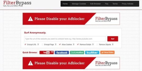 Un altro servizio di Web Proxy che ti consiglio di prendere in seria considerazione è FilterBypass che presenta dei comodi pulsanti di accesso rapido a servizi come YouTube, Facebook e Twitter. Il suo funzionamento non è dissimile da quello di Hide My Ass.