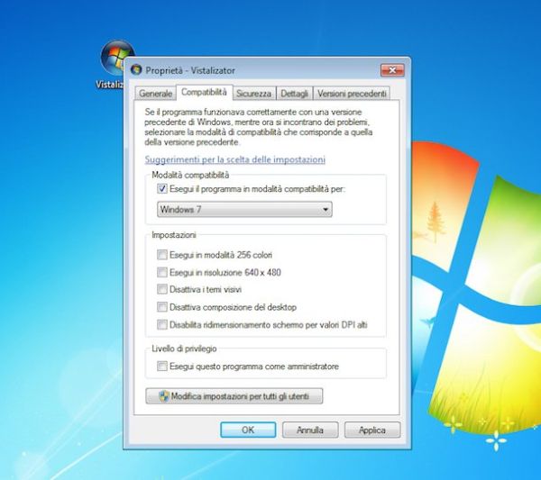 Per farlo, clicca con il pulsante destro del mouse sul file Vistalizator.exe e seleziona la voce Proprietà dal menu che compare. Nella finestra che si apre clicca sulla scheda Compatibilità, metti il segno di spunta accanto alla voce Esegui il programma in modalità compatibile per, seleziona Windows 7 dal menu a tendina e clicca prima su OK e poi su Applica per salvare le impostazioni.
