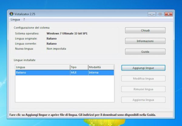Se stai utilizzando una copia di Windows 7 in versione, per così dire, "base" (Starter, Home Basic, Home Premium o Professional) tutto quello che ti serve per tradurre Windows 7 da qualsiasi lingua a qualsiasi altro idioma è Vistalizator. Si tratta di un piccolo programma gratuito che permette di modificare la lingua del sistema operativo anche quando si utilizzano versioni casalinghe o basilari dello stesso.
