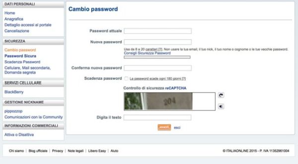 Ad operazione completata, copia il codice di sicurezza illustrato in fondo alla pagina nell'apposito campo di testo e pigia sul pulsante avantiper confermare il cambio della parola chiave. Se vuoi, puoi anche impostare il servizio in modo che la tua password scada automaticamente (e quindi debba essere cambiata) ogni 180 giorni: basta apporre il segno di spunta accanto alla dicitura La password scade ogni 180 giorni prima di cliccare sul pulsante avanti.