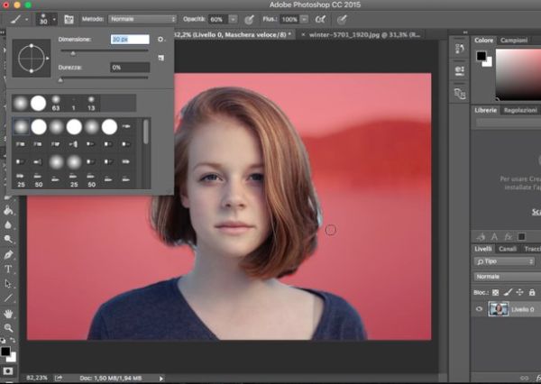Se vuoi evitare sbavature, utilizza un pennello dalla punta morbida, di dimensioni non eccessivamente grandi e con un livello di opacità del 50-60% in modo da poter fare più "passate" per definire la selezione (tutte le impostazioni del pennello si possono regolare nel menu che compare in alto, immediatamente sotto la barra del titolo di Photoshop).