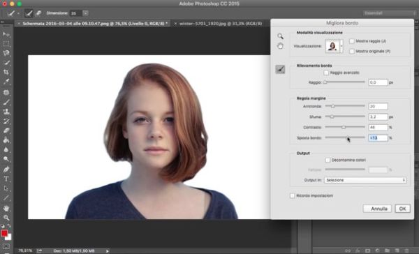 Dopodiché clicca sul pulsante Migliora bordo che si trova in alto a destra e utilizza le barre di regolazione relative alle funzioni Arrotonda, Sfuma, Contrasto e Sposta bordo per rendere la selezione del soggetto quanto più naturale possibile (non devono esserci bordi seghettati, sfumature o altre deformazioni).