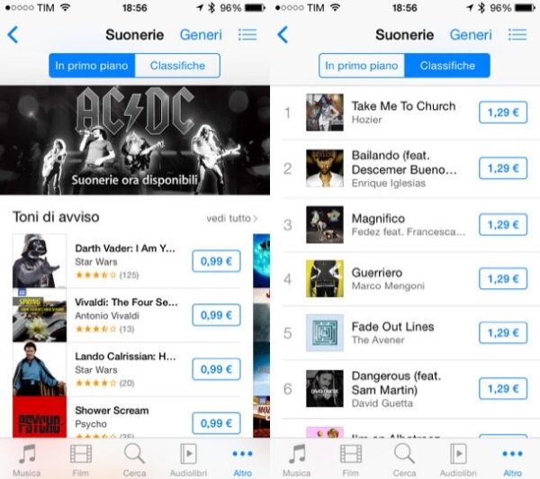 Nella schermata che si apre, dai un'occhiata alle suonerie e ai toni di avviso più in voga del momento sfogliando gli appositi menu e, se trovi qualche suoneria di tuo interesse, pigia prima sulla sua immagine di copertina e poi sul suo titolo per ascoltarne un'anteprima. Per acquistare una suoneria o un suono di notifica di tuo gradimento, pigia sul pulsante con il prezzo collocato accanto al suo titolo e conferma l'acquisto facendo tap sulla voce Acquista la suoneria. Nel caso in cui ti venga chiesto di verificare la tu identità, digita la password dell'ID Apple o poggia il dito sul tasto Home (se hai un iPhone dotato di sensore Touch ID).