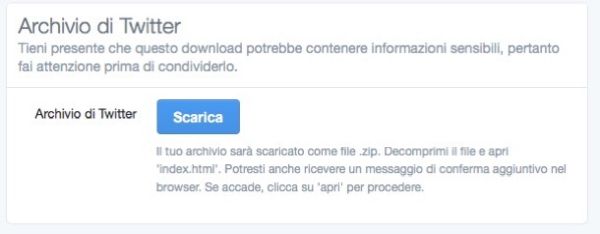 Otterrai un archivio zip con all'interno un file html con l'indice di tutti i tuoi tweet (index.html) e tutti i file necessari alla visualizzazione di questi ultimi.