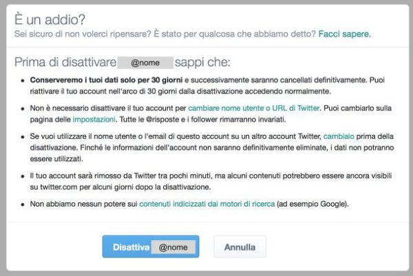 Come già sottolineato in precedenza, dopo aver comandato la disattivazione dell'account, parte un periodo di 30 giorni durante il quale, volendo, potrai riattivare il tuo account su Twitter semplicemente effettuando l'accesso a quest'ultimo. Se entro 30 giorni non effettuerai alcun accesso al tuo account, questo verrà eliminato definitivamente da Twitter insieme ai relativi dati. Il tuo profilo, nonostante l'eliminazione, potrebbe rimanere indicizzato per qualche tempo sui motori di ricerca (es. Google), ma questo non dipende da Twitter e comunque si risolve automaticamente con il tempo.