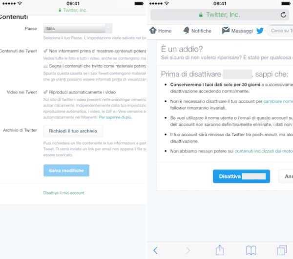 La procedura per cancellare account Twitter non può essere ancora effettuata dalla app ufficiale del social network per dispositivi mobili. L'unica cosa che puoi fare è visitare il sito di Twitter da smartphone o tablet attivando la modalità di visualizzazione desktop e seguire i passaggi visti in precedenza per la disattivazione del profilo da PC.