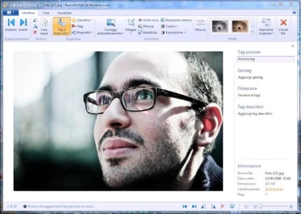 Per applicare tag, didascalie e valutazioni (stelline) alle tue foto, fai doppio click sulle loro anteprime nella schermata principale di Raccolta Foto ed utilizza i pulsanti presenti nella barra degli strumenti in alto: cliccando sul pulsante Tag e didascalia potrai inserire tag per descrivere le caratteristiche della foto (es. vacanze, compleanni, ecc.), taggare le persone ritratte in esse (come si fa su Facebook), aggiungere una didascalia per descrivere la scena oppure classificare la foto assegnandole da 1 a 5 stelle; cliccando sul pulsante Ritocca potrai correggere luminosità, colori e imperfezioni della foto grazie a dei filtri automatici, e così via.