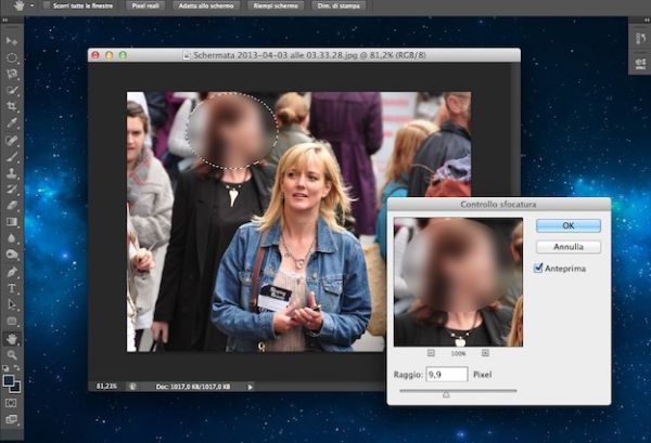 A questo punto, utilizza il mouse per “disegnare” un'ellisse intorno al volto della persona da oscurare nella foto e, dopo aver realizzato la selezione, clicca sulla voce Controllo sfocatura contenuta nel menu Filtro > Sfocatura di Photoshop. Nella finestra che si apre, sposta l'indicatore del Raggio verso destra (in modo da ottenere un valore di circa 10 pixel) e clicca sul pulsante OK per censurare la porzione di immagine selezionata in precedenza (nel nostro caso, il volto della persona da proteggere per questioni di privacy).